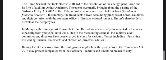 Solved The Enron Scandal That Took Place In 2001 Led To The Chegg Com